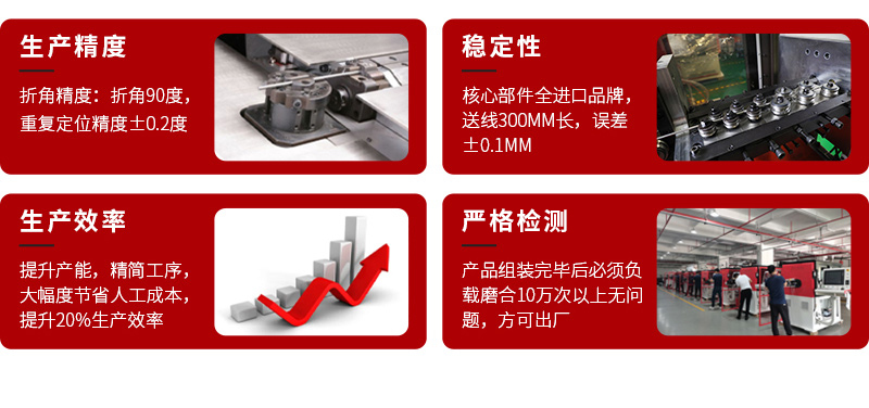 產(chǎn)品特點(diǎn):折彎采用內(nèi)外轉(zhuǎn)同步折彎,可折側(cè)彎,立彎,扭彎;切斷模組帶有預(yù)壓功能防止切口有毛刺,切口平整;設(shè)備自帶壓凸點(diǎn),沖孔,壓LOGO,修披風(fēng)(選配);設(shè)備自帶輔助送線裝置一人可輕松跟換材料。